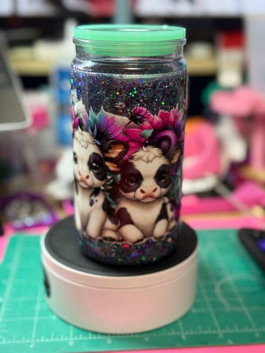 Baby Highland cows with glitter flow 16 oz glass snow globe with handle